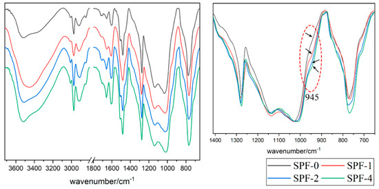 The degree of reaction of Si-OH and Ph-OH varied between the cured SPF samples (80 °C/10 h + 120 °C/2 h + 180 °C/4 h). As shown in Figure 7, with the content of Si-OH in silicon resins increasing, the intensity of the peak at 945 cm−1 attributed to Si-O-Ph became stronger, which illustrated that the higher Si-OH content in SRs, the more reaction with Ph-OH. Thus, the cured SPF-4 had the most Si-O-Ph bonds.