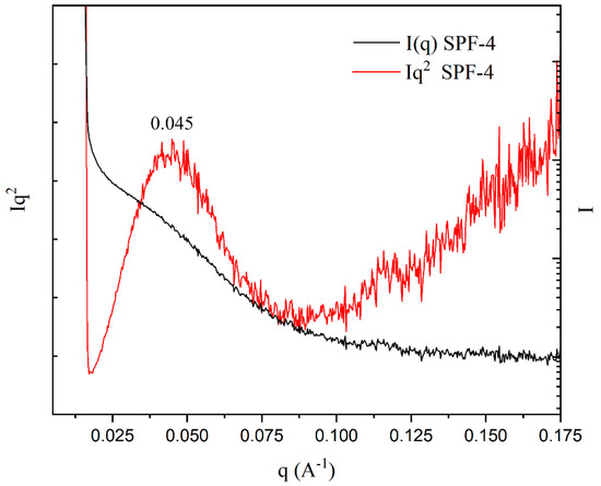 In order to further detect the phase structure of SPF-4, small-angle X-ray scattering (SAXS) was used to detect thin film of the cured hybrid SPF-4 resins. Electron density contrast difference between phenolic resins and silicon resins [36] was detected and scattering intensity (I) in the scattering vector range (q) (0.01~0.14 A−1) was obtained. Iq2, Lorentz-correction scattered intensity, can be used to analyze the degree of phase separation in the cured hybrid resins and highlight the position of the SAXS peak [37]. I~q and Iq2~q are plotted in Figure 9. The q peak value was estimated to 0.045 A−1, which corresponded to a phase domain length for the cured SPF-4 of = 14 nm.