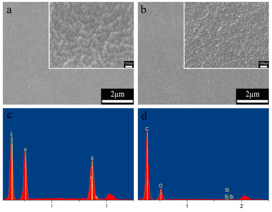 SEM images of the fractured surface of SPF-4 before (a) and after HF-etching (b). Higher magnified images were inserted, respectively. The EDX result is correspondingly shown below in (c) and (d).