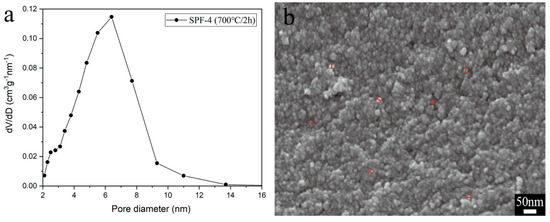 BJH (Barrett-Joyner-Halenda) pore size distribution plots (a) and SEM image (b) of the cured SPF-4 resins oxidized for 2 h at 700 °C.