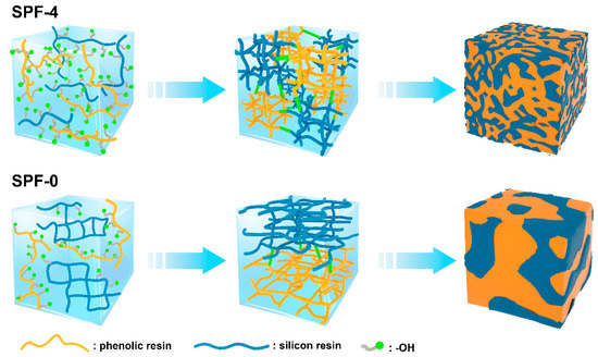 The phase structure formation process was schematically shown in Figure 12, where SPF-4 and SPF-0 were given in contrast. More silanol groups remained and a lower degree of condensation for silicon resin increase the possibility of silanol groups reacting with phenolic hydroxyl, which resulted in more Si-O-Ph bonds being formed in the cured SPF-4 hybrid resins. Increasing Si-O-Ph formation can improve compatibility between silicon resin and phenolic resin, which can result in nanoscale phase separation rather than macroscopic phase separation. Therefore, the number of silanol groups in the SRs increased, and the length ofphase structure decreased.