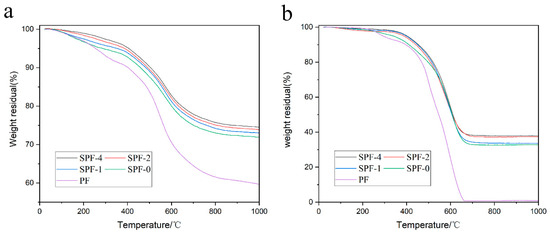 TGA curves of cured PF and SPF resins: (a) in N2 atmosphere and (b) in the air atmosphere.