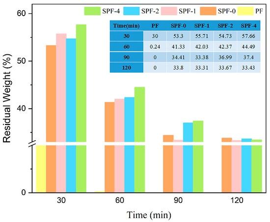 The weight retention of the cured SPFs after oxidation at 1000 °C for a different time in a muffle furnace.
