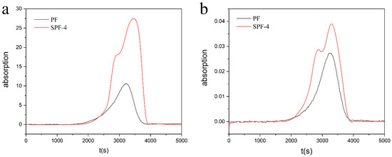 In order to further verify the better oxidation resistance of SPF-4 compared to PF, TG-IR was conducted to probe volatile products during degradation in air. The main volatile products were CO2 and CO, and the low amount of the main degradation products meant the slow decomposition rate of the resins, reflecting good thermal stability. The intensity of absorption peak for volatilized CO2 and CO compounds versus time, as shown in Figure 16. The maximum absorption intensity of volatilized CO2 for PF was about 27.53, and that for SPF-4 decreased to 10.59. The variation tendency of volatilized CO was in keeping with volatilized CO2. It indicated that the amount of the main degradation products decreased and the thermal properties improved obviously via introducing silicon resins to phenolic resins, which can be attributed to the formation of a compact Si-rich layer and Si-O-Ph bond.