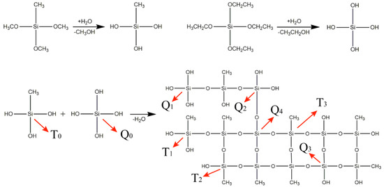 The hydrolysis and condensation reactions of TEOS and MTMS.
