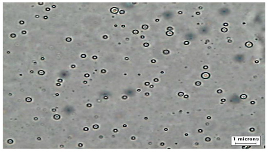 Palm oil with various water contents added, ranging from 0.02 wt.% to 0.12 wt.%, was used as the raw oil to undergo a methanol assisted transesterification reaction with strong alkaline catalyst NaOH. A micrograph of the added water droplets of 0.05 wt.% distributed within the palm oil layer captured by an optical electron microscope in conjunction with a charged-couple device is shown in Figure 1. A rather even distribution of micrometer-sized water droplets within the palm oil layer at 50× magnification was observed. The mean diameter of the water droplets was 0.229 μm. Mechanical stirring using a homogenizer was employed to mix the added water of 0.05 wt.% with the palm oil without adding any surfactant before observing and capturing the results using optical microscope equipment. Micro-explosion might occur after the μm-sized water droplets absorbed sufficient surrounding heat to explode outwards through enveloping oil layer [26], leading to much increase of contacting surface among the reactants and in turn a larger extent of chemical reaction. In addition, the even distribution of μm-sized water droplets in palm oil might increase the homogeneous mixing extent with hydrophilic methanol, leading to enhancement of alkali-catalyzed reaction and formation of fatty acid methyl esters.