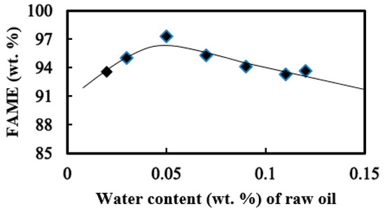 Bitonto and Pastore [6] found that water content, acid value, and free fatty acids (FFA) of feedstock oils should be lower than 0.06 wt.%, 1 mg KOH/g, and 0.5 wt.%, respectively, to prevent negative effects on the biodiesel product. Hakimi et al. [7] even suggested all reactants should be substantially anhydrous during alkali-catalyzed transesterification. Yasar [8] studied the effect of water content of the feedstock on the ester content of biodiesel. Chen et al. [9] further indicated that the upper limit of water content in raw oil is 0.05 wt.%, for which the conversion rate of transesterification could reach above 90%. The conversion rate is only 5.6% if the added water in feedstock oil is 5 wt.%. Shi et al. [10], after investigating the effects of water content in rapeseed oil on transesterification, found that the addition of 2.5 wt.% to the feedstock oil achieved the highest conversion rate of transesterification. They considered that the addition of an adequate amount of water enhances the hydrolysis of fatty acids. However, the free fatty acids formed from such a hydrolysis process facilitate a transesterification reaction towards biodiesel production [11].