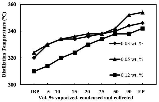 The ASTM D86 distillation temperature curve for biodiesel made from palm oil with various water contents added, ranging from 0.03 wt.% to 0.12 wt.%, is shown in Figure 7. Biodiesel made from palm oil with 0.05 wt.% water added was found to have the highest distillation temperature, while that with 0.12 wt.% water added had the lowest distillation temperatures among those three biodiesels. For example, the TEP of the biodiesel made from palm oil added with 0.05 wt.% and 0.12 wt.% water contents were 354 and 342 °C, respectively. This is ascribed to the fact that the addition of 0.05 wt.% water content caused the highest formation of fatty acid methyl esters (FAME), while that of 0.12 wt.% water formed the lowest FAME, as shown in Figure 2. In addition, Yao et al. [55] considered that T90 is an indicator for the content of heavier compounds in liquid fuel. A higher T90 implies a larger amount of heavier compounds and greater viscosity of a liquid fuel, which might result in deteriorated atomization, slower vaporization, and in turn, incomplete burning. The biodiesel made from palm oil with 0.05 wt.% water added was shown to have the highest T90, which thus implies production of a higher extent of pollutants from burning such biodiesel. Distillation temperature influences the combustion and emission characteristics of biodiesel. Lower distillation temperature results in higher volatility and enhances homogeneity of reactant mixture [56].