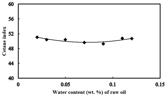 The cetane number (CN) is used to indicate the compression-ignition quality of liquid fuel in a diesel engine. Fuel bearing a higher cetane number would shorten the period of ignition delay in a diesel engine and thus reduce the burning time and residence period of the peak flame within the engine cylinder, resulting in a lower occurrence of engine knocking and NOx formation. The cetane index, which is an alternative to the cetane number, is obtained by calculations using the data from T50 and API gravity based on Equation (3). The lowest cetane index is found for biodiesel made from palm oil with 0.09 wt.% water added, shown in Figure 8. This is probably due to its larger T50 and the specific gravity of the biodiesel, as shown in Figure 4. A higher cetane index existed when water content that was either lower or higher than 0.09 wt.% was added to palm oil for manufacturing the biodiesel. Cetane number of biodiesel was determined by its fatty acid composition, number of double bonds, degree of unsaturation, chain length, and molecular weight [57]. A few correlation equations which relate cetane number with those physicochemical properties of biodiesel have been proposed for CN prediction [58,59]. In addition, Mishra et al. [60] and Moser [61] found that the cetane number of the biodiesel increased with the increased amount of long carbon-chain fatty acids or saturated fatty acids. It was found that the increase of number of double bonds leads to the decrease of cetane number of biodiesel [62]. Higher or lower water content than 0.09 wt.% might cause an increase in saturated fatty acids and heating value in turn. Hence, those two curve trends between the cetane index and heating value agree well with each other in comparison with Figure 3 and Figure 8.