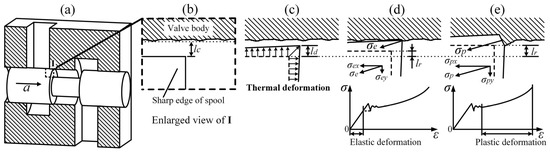 Figure 1a shows the standard structure of a spool valve, mainly comprising the valve body and spool. The spool moves along the valve hole at an acceleration of ‘a’ m2/s (the value of ‘a’ can be 0 m2/s). The valve opening undergoes positive, zero and negative opening stages. An enlarged micron-level view of valve orifice when the sharp edge of the spool has slid into the valve hole is shown in Figure 1b. Ideally, a certain clearance lc exists between the valve hole and spool; in this study, it is called ‘unilateral clearance’ of the spool valve, and it allows the lubricating oil to fully fill the clearance, ensuring that the spool moves smoothly. However, in reality, before the spool slides into the valve hole, it works under hydraulic pressure for a certain period of time, inevitably generating thermal deformation and radial thermal deformation ld, as shown in Figure 1c, reducing the radial fretting allowance. Making the spool absolutely collinear with the valve hole is difficult at the micron level, and radial fretting allowance lr is generated. As indicated in Figure 1d, when lr = lc − ld, the sharp edge of the spool comes into contact with the wall of the valve hole. Given that the surface of the valve hole wall is rough, elastic stress σe is generated; it increases linearly with elastic deformation ε and resolves small component force σex along the medial axis of the valve hole, thereby impeding the action of the spool. Figure 1e shows that when lc − ld < lr < lc, the sharp edge of the spool jams into the wall of the valve hole and subsequently generates plastic stress σd. σd increases exponentially with plastic deformation ε and resolves large component force σpx along the medial axis of the valve hole, thereby causing spool clamping.