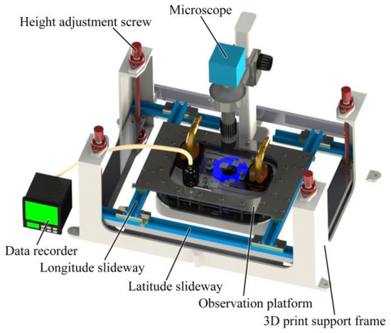 In accordance with the valve orifice experimental model, a device was designed to collect temperature data and an image of the deformation of the valve orifice. Figure 3 shows a 3D diagram of said device. It includes a support frame made by 3D printing, and the longitude slideway, the latitude slideway and the height adjustment screw are used to adjust the position of the observation platform of the microscope.