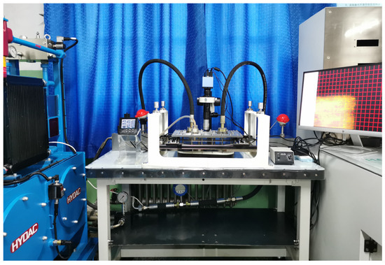 The actual platform used in the experiment is shown in Figure 5. A miniature Type T thermocouple with a measuring range of 0–150 °C was used, the measurement accuracy of which is ±0.5 °C. The microscope has an observation accuracy of 1 μm and an assessment precision of 0.1 μm. The pressure-resistant range is 0–3.5 MPa. The technical features of the platform are as follows: Measurement of the temperature distribution of valve orifice in real time, synchronous observation of the thermal deformation, use of 3D printing technology in building adjustable support device. Additionally, HM46 hydraulic oil was used as the fluid oil, and the inlet pressure of the device was adjusted using the relief valve. Because the oil in an open oil tank is exposed to the atmosphere, the outlet pressure is roughly the same as that of atmospheric pressure, meaning that the inlet pressure can be used to represent the pressure drop in the valve orifice.