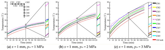 Figure 6 indicates that the temperatures of the different locations increased gradually and synchronously with time and were distributed in layers. The curves at 60 min were enlarged within a small temperature range because these curves crowded together under a large temperature range. Comparison of Figure 6a–c shows that when inlet pressures were at 1 MPa, 2 MPa and 3 MPa, the temperatures of the sharp edge (CH5) became 41.9 °C, 52.8 °C and 61.4 °C, respectively. This result means that there is a strong positive correlation between the heating rate of the valve orifice and the drop in pressure. Given T0(t) as the reference temperature of the oil tank, T1(t) is the temperature of the sharp edge (CH5), and is the time-average value of T1(t) − T0(t). Upon calculation, we can see that when pin = 1 MPa, ≈ 5.8 °C; when pin = 2 MPa, ≈ 8.5 °C; when pin = 1 MPa, ≈ 14.6 °C. This indicates that the higher the pressure drop, the higher the local temperature of the sharp edge.