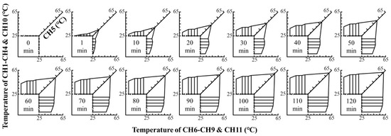 Radar charts are created every 10 min in accordance with the curves in Figure 6b to illustrate intuitively the temperature distribution and change in the valve orifice. These charts are shown in Figure 7.