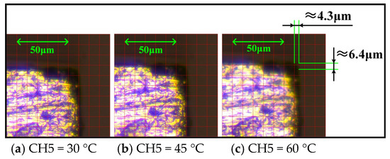 Figure 8 indicates that as the temperature of the sharp edge increased from 30 °C to 60 °C, the deformation in the horizontal and vertical directions was approximately 4.3 μm and 6.4 μm, respectively. The sum of the squares of deformation in both the horizontal and vertical directions was calculated, and the root was determined to obtain the deformation of the sharp edge (~7.7 μm). The observation result can be perceived directly but is lacking in accuracy; hence, the value of thermal deformation needs to be further quantified.