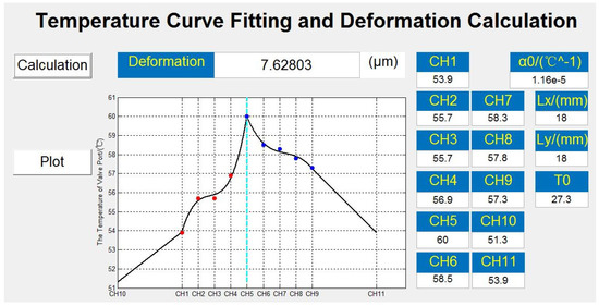 For convenience in calculation, a computer program and application interface were built in accordance with the optimal algorithm, as shown in Figure 11. Users only need to input the measurement temperature data of the valve orifice, the coefficient α0 and the parameters lx, ly and T0; then, the temperature distribution curves of the valve wall will be given, and the maximum thermal deformation will be outputted immediately.