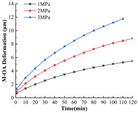 The thermal deformations of the valve orifice under inlet pressures of 1 MPa, 2 MPa and 3 MPa and at 120 min were calculated with the M-OA method, as indicated in Figure 12.