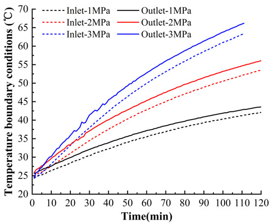 Boundary conditions can directly affect the accuracy of a simulation. The measurement data under inlet pressures of 1 MPa, 2 MPa and 3 MPa were adopted as the boundary conditions of the simulation. After viscous heating of the valve orifice, the outlet temperature became higher than the inlet temperature. The data of CH10 were adopted as the inlet temperature, and the data of CH11 were used as the outlet temperature, as indicated in Figure 13.