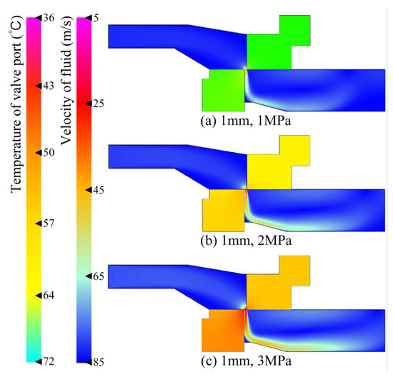 On the basis of the fluid–solid–heat coupling simulation, the temperature fields at different inlet pressures, valve opening of 1 mm and moment of 60 min are presented in Figure 14 to analyze the relationship amongst pressure drop, fluid velocity and temperature in the valve orifice. As indicated in Figure 14a–c, a wake flow was generated at the rear end of the valve orifice, and the fluid velocity near the sharp edge was higher than that in other locations in the flow field. When the inlet pressures were 1 MPa, 2 MPa and 3 MPa, the maximum fluid velocities of the wake flows were 45 m/s, 65 m/s and 80 m/s, respectively, and the highest temperatures in the valve orifices were 42 °C, 56 °C and 65 °C, respectively (indicated in Figure 14a–c). This result means that the large pressure drop led to high fluid velocity and increased the temperature of the valve orifice.