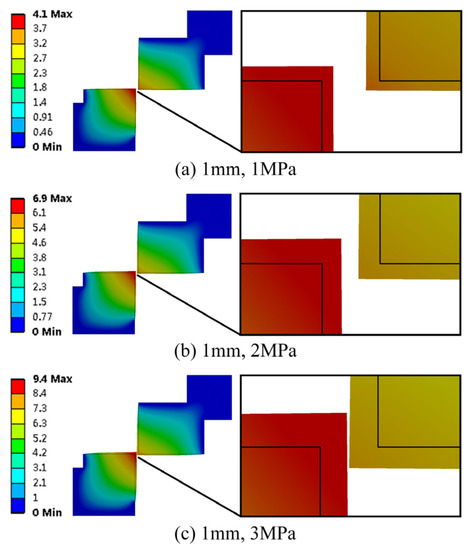The thermal deformation of the valve orifice corresponding to Figure 14 after calculation with the static–structural module is indicated in Figure 15. When the inlet pressures were 1 MPa, 2 MPa and 3 MPa, the corresponding thermal deformations were 4.1 μm, 6.9 μm and 9.4 μm, respectively, which means that under the same valve opening, thermal deformation increased while pressure dropped.