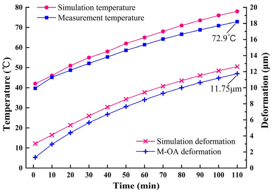 The temperature results of the measurement and simulation and the deformation results of M-OA and the simulation at 60 min are presented in Table 3.