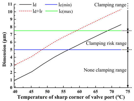 It is noteworthy that the spool clamping is not only caused by thermal deformation of the spool but also by thermal deformation of the valve hole; what is more, the spool can also generate a radial displacement when sliding in the valve hole. The extra deformation and displacement are combined and marked as ‘lr’. lr is determined by the processing technology and assembly process, so it is not a certain value. As Figure 17 shows, compared with the curve of ld, the curve of ld + lr in the clamping risk range and clamping range increased obviously, which means that the clamping risk will rise when thermal deformation of the valve hole and radial displacement of the spool are taken into consideration.