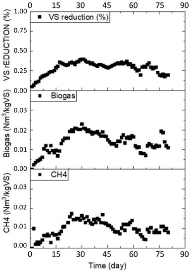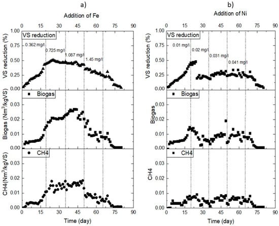 The impact of an incremental dose of Fe on the anaerobic digestion process was analyzed by increasing the dose of Fe from 0.362 to 1.45 mg/L, in a stepwise fashion. The effect of each dose of Fe was monitored for 15 days. We noted that Fe addition increased biogas production and CH4 production in the range of 0.013 and 0.021 Nm3/kg VS, respectively; the corresponding VS reduction was increased by 10%. The impact of Fe addition is shown in Figure 3. The addition of Fe improved AD performance until the 70th day. Then, the process of digestion began to deteriorate and this can be seen clearly through Figure 3a. The addition of Fe increased and accelerated the initial exponential biogas yield and methane production rate. The same results for Fe addition were noted by Kim et al. (2002); they reported that the addition of certain HMs to the feed materials in AD has been found to increase biogas and methane production and the removal efficiency of propionate when high levels of volatile fatty acid were experienced []. Gonzalez-Gil et al. (1999) also concluded that the addition of FeCl3 caused an increase in the concentration of methane in the biogas to values which were higher than 60 v% []. Dealing with the influence of increasing doses of Ni, from 0.01 to 0.041 mg/L, on the anaerobic digestion process, this resulted in a performance decrease, as shown in Figure 3b. The digestion process continued, but at a low rate until the 70th day, and afterward, it stopped. The biogas production of the AR with Ni addition, compared to the AR without any addition, decreased to a value of 0.083 Nm3/kg VS, but the concentration of CH4 was higher. The VS reduction was in the range of 19w%. This result is in agreement with what was reported in Kumar et al. (2006) [], who analyzed the effect of HMs on potato waste anaerobic digestion. They reported that the AD process improved in terms of biogas production through the addition of HMs at concentrations of 2.5 mg/L (wet basis). The biggest increase was obtained adding Cd, followed by Ni, and then, by Zn.