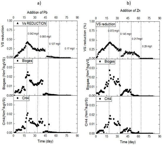 (a)—Impact of Pb on the anaerobic digestion performance; (b)—Impact of Zn on the anaerobic digestion performance
