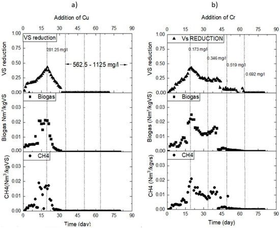 By adding increasing doses of Cr, ranging from 0.173 to 0.692 mg/L, a remarkable reduction in the performance of AD was exhibited. When the concentration of Cr in the feed was up to 0.519 mg/L, as compared to the AR without any addition of HMs, the volume of the daily generated biogas, CH4 production, and VS reduction were reduced by 59%, 56%, and 55%, respectively. The Cr performance is shown in Figure 5b.