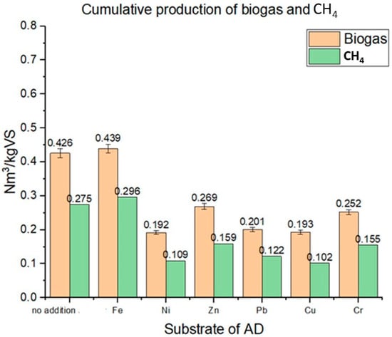 Small concentrations of HMs such as Fe, Ni, and Co are needed to improve the efficiency of biogas production in the AD process []. Therefore, they can be considered to have a positive action. On the other hand, Pb, Cu, and As affect negatively the efficiency of the AD process; this is due to the toxic effect exerted on AD microorganisms []. Some studies reported that certain HMs ions can inhibit enzymes that are produced by microorganisms, thus HMs like Zn, Cu, Cr, and Pb inhibit the AD process [].