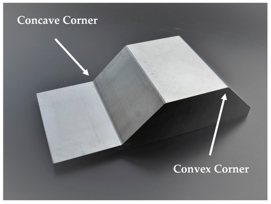 A mold was manufactured from a single block of aluminum using computer numerical control (CNC) machining with a tolerance of ± 0.5 mm, as shown in Figure 2. The mold has a convex and a concave corner at 45° each with a corner radius of 6.35 mm. All corners were rounded to a radius of 2 mm, to avoid rupturing of the bag under vacuum. All flat and inclined flanges of the mold have dimensions of 65 mm × 100 mm. This mold was used in the manufacturing of all sets of specimens for various bagging techniques and curing profiles. An intensifier of dimensions 65 mm × 100 mm with a 45° convex corner was manufactured to perfectly fit on the concave side of the mold using wire cut. All corners of the intensifier were rounded to a radius of 2 mm, to avoid rupturing of the bag under vacuum. The corner radius between the flat and inclined flanges of the intensifier was 6.35 mm. For the convex corner, a 3 mm thick stainless steel bent at 45° with a corner radius of 6.35 mm was used. These intensifiers were used to manufacture composite laminates using MSVB techniques with various curing profiles.