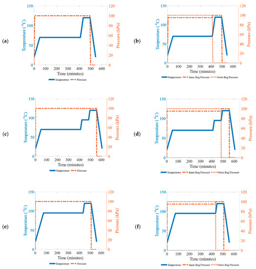 Conventionally, a two-step ramp and dwell temperature and pressure profiles, usually referred to as manufacturer’s recommended cure cycle (MRCC), are recommended by the prepreg suppliers. The low-temperature dwell of a typical cure cycle, also known as B-stage or TB, permits the depletion of volatiles and impregnation of resin into dry tows, whereas, the high-temperature dwell, also referred to as C-stage or TC, allows the resin cross-linking and consolidation into a solid final product [24]. The mechanical properties for commercially available prepregs could be further improved by taking induced residual stress/strain into consideration during curing [25,26,27]. Takagaki et al. [26] conducted an in situ residual stress/strain investigation using MRCC and proposed two new cure cycles which ultimately reduced residual strain by 12–18% while tensile strength improved up to 26%. Extended manufacturer’s recommended cure cycle (EMRCC) consists of an extra temperature dwell TB2 after the first TB. The drawback of EMRCC is it requires a relatively longer curing time compared to that of MRCC. Direct cure cycle (DC), on the other hand, raised TB closer to TC. Samples produced using DC are reported to suffer from reduced tensile strength, despite an 18% improved residual strain when compared to those of MRCC. The modified cycles showed no significant changes in the void content. To date, the information on the effects of various bagging techniques for composites with complex shapes produced using these cure cycles are not readily available.