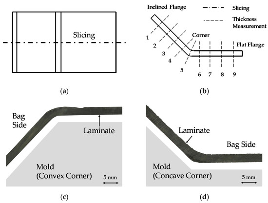 Schematics of (a) slicing of composite laminate from the center in a longitudinal direction and (b) cross-sectional view of composite laminates with thickness measurement locations. The actual specimens slicing and thickness measurement criteria are uniform in both (c) concave- and (d) convex- cornered composite laminates.