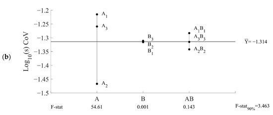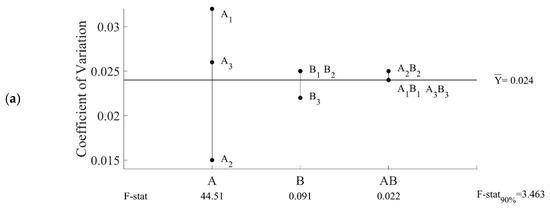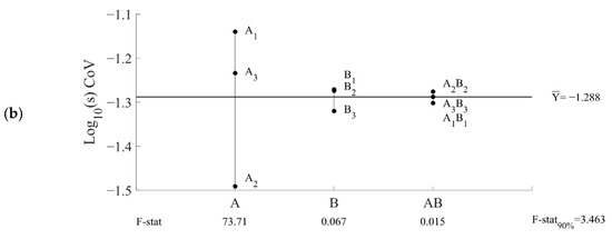 In terms of thickness variation, the lesser CoV is desirable as it illustrates a lower variation in the thickness across the entire laminated composite. The lesser variation in the laminate thickness ensures uniformity in the composite structure. The results for CoV in the laminate thickness produced on the concave corner of the mold and their variability are shown in Figure 5a,b respectively. The grand means () are mentioned in the center right, F-stat shows the calculated F-statistic values while F-stat90% illustrates the critical F-statistic value at 90% confidence. The grand means of the CoV and variability for concave-cornered laminates are 0.024 and −1.288, respectively. Within the scope of this study, vacuum bagging technique is the only parameter to demonstrate a statistically significant effect on the laminate thickness with an F-stat of 44.51(>F90%). SVB was chosen as a base technique to compare with others since it is a conventional method. SVB exhibited the highest variation in thickness, followed by DVB, while MSVB exhibited the lowest thickness variation. The highest CoV of 0.032 (3.2% deviation) in the SVB is attributed to the bridging effect, in which the laminate does not conform to the mold shape completely, hence the thickness in the concave corner is higher than the rest of the laminates. It is difficult for the complex-shaped laminate (concave in this case) to conform to the shape of laminate with only 1 atm pressure. Although the corner radius is provided in the mold to prevent major corner deviation, the decrease in the reaction pressure on the corner regions causes insufficient pressure application on the concave corner regions, as demonstrated by Arthur Levy and Pascal Hubert [34]. The thickness variation in DVB witnessed a 22.84% improvement when compared to those of SVB. Whereas, MSVB technique witnessed a tremendous improvement of 110.81% when compared to those of SVB technique with a CoV of 0.015. The use of intensifiers on the concave corner increases the pressure distribution conditions to prevent bridging. This finding has also been reported in a previous study [29]. The thickness deviations reported in this study for laminates with concave corner produced using MSVB technique are in good agreement with their findings.