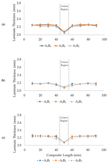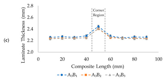 Curing cycles and their interaction with bagging techniques were found to be statistically insignificant. This shows that the main factor in controlling the thickness of laminated composites (with concave corners) is attributed to the bagging techniques and consolidation method. The variability in the results of thickness variation in the concave corner illustrates the statistical significance of bagging techniques with an F-stat of 73.71 (>F90%). SVB and DVB techniques exhibited massive variations with standard deviations of 0.073 and 0.058, respectively. The variability in the results is better understood by plotting the average thickness of laminates across the length, as shown in Figure 6. The thickness fluctuates excessively in SVB when compared to those of MSVB and DVB. It is noticed that the variation in the flat flange of the laminate is lower than the inclined flange in all three cases. The highest corner thickening is also observed in SVB and DVB which are averaged at 2.455 mm and 2.420 mm, as shown in Figure 6a,c, respectively. Major corner thickening in these techniques in comparison to the rest of the laminate thickness is offsetting the CoV values. Whereas, MSVB witnesses a significant improvement of 10.34% in corner thickness when compared to SVB with an average corner thickness of 2.225 mm, as shown in Figure 6b. This improvement is due to the application of an intensifier in the corner region. It is also observed that the entire laminate thickness for MSVB is averaged at 2.156 mm, which is 6.76% thinner than the SVB, indicating the effective laminate consolidation.