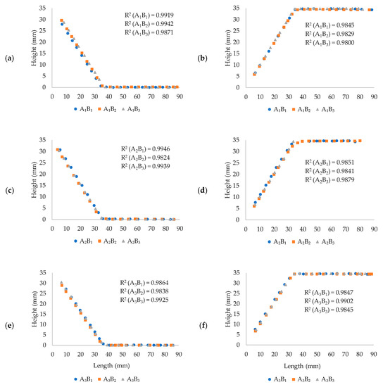 Traces of laminated composites produced using (a) SVB for a concave corner, (b) SVB for a convex corner, (c) MSVB for a concave corner, (d) MSVB for a convex corner, (e) DVB for a concave corner, and (f) DVB for a convex corner.