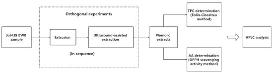 The scheme of optimizing Jizi439 BWB extrusion and extraction processing steps are shown in Figure 1. Two orthogonal experiments were conducted, respectively, for extrusion and ultrasound-assisted extraction (UAE). Total phenolic content (TPC) and antioxidant activity (AA, in terms of DPPH scavenging activity) were used as responses. After optimization, the Jizi439 BWB was divided into four groups, including: (1) NENU group, raw bran without extrusion and phenolics were extracted without ultrasound; (2) E group, extruded bran whose phenolics were extracted without ultrasound, (3) U group, raw bran with UAE; and (4) EU group, extruded bran with UAE. White wheat bran, without extrusion and ultrasound, was used as a control. Total phenolic content and antioxidant activity were compared among each group. The profile of phenolic compounds in the extracts was compared among NENU, EU, and control groups.