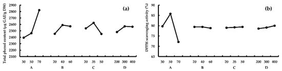 Range analysis. According to Table 5, for response TPC, RA > RC > RB > RD, this means A (temperature) had the greatest effect on TPC, followed by C (ultrasonic frequency), B (time) and D (ultrasonic power). And the optimum process combination was A3B2C2D2, according to k values. For response AA, results showed that RA > RD > RB > Rc, which means A had the greatest effect on AA, followed by D and B, and the optimum combination was A2B1(B2)C3D3, according to k values. TPC and AA reached peaks at 70 °C and 50 °C, respectively (Figure 3). The results of the verification experiment showed that both higher TPC (2856.3 ± 57.7 μg GAE/g DW) and AA (85.5% ± 1.1%) were obtained under combination A2B2C2D2. Thus, A2B2C2D2 (50 °C, 40 min, ultrasonic frequency 35 kHz, and ultrasonic power 300 W) should be the optimum UAE conditions.