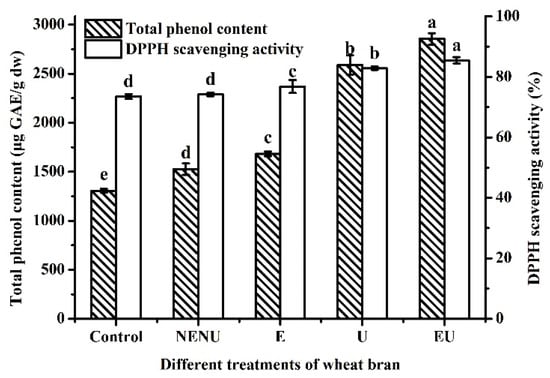 Effect of different treatments on TPC and AA of Jizi439 BWB. Control, white wheat bran (without extrusion and UAE); NENU, raw black wheat bran (without extrusion and UAE); E, extruded but without UAE black wheat bran; U, UAE but without extruded black wheat bran; EU, extruded, and UAE black wheat bran. (a–e) Indicate a significant difference between different groups (n = 3; p < 0.05).