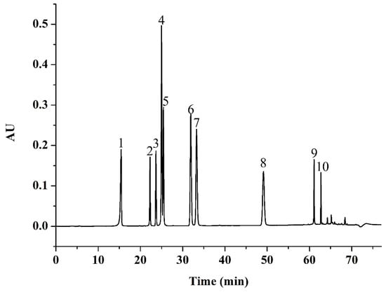 HPLC chromatogram of mixed standards. Peak 1, gallic acid; 2, chlorogenic acid; 3, p-hydroxybenzoic acid; 4, vanillic acid and caffeic acid; 5, syringic acid; 6, p-coumaric acid; 7, ferulic acid; 8, o-coumaric acid; 9, luteolin; 10, apigenin.
