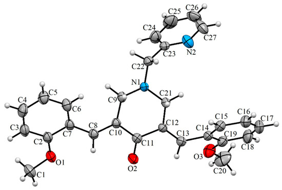 In the contemporary work, we envisioned synthesizing the target compounds 5(a–h) from the reaction of 3,5-bis[(E)-arylmethylidene]tetrahydro-4(1H)-pyridinones 3(a–h) and 2-(chloromethyl)pyridine hydrochloride 4 (Scheme 1). The synthesis of the prerequisite compounds 3(a–h) was performed based on a literature method reported by Dimmock et al. [17]. Primarily, in order to determine the optimum reaction conditions, a typical reaction comprising an equimolar ratio of 3c and 4 was performed in diverse organic solvents, viz. dioxane, methanol, acetonitrile, ethanol, chloroform, and dimethylformamide (DMF). Among the solvents employed, acetonitrile was found be optimal for this transformation in terms of reaction time and yield. The target compound, viz. the α,β-unsaturated carbonyl compound 5c, was obtained in good yield. Similarly, the other reactions with diversely substituted aryl rings 3(a,b) and 3(d–h) were also accomplished under these optimized reaction conditions and a good yield of the products 5(a,b) and 5(d–h) was obtained. The structure of the target compounds 5(a–h) was derived through IR, NMR spectroscopy, and mass spectrometry data. Furthermore, the stereochemistry of these compounds was determined by single crystal X-ray crystallographic studies of 5c (Figure 1) [25].