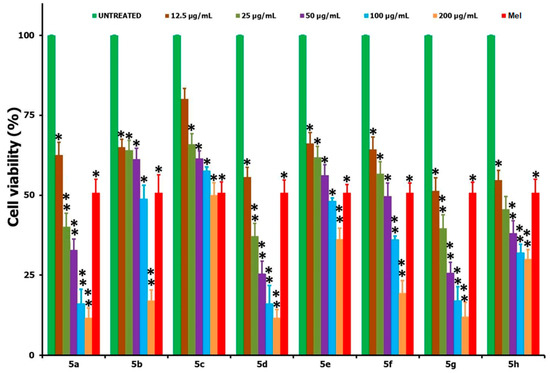 Comparison of the in vitro cell viability studies provided by the MTT assay when the HepG2 cancer cells were treated with compounds 5(a–h) at different concentrations in the range of 12.5–200 µg/mL for a 24 h period. STD corresponds to Melphalan (Mel) (15 µg/mL); * and ** correspond to the significant (p < 0.05) and highly significant (p < 0.01) values, respectively, against the untreated controlled measurements.