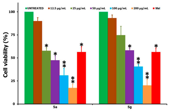 Comparison of the in vitro cell viability studies provided by the MTT assay when the L929 non-cancer cells were treated with 5a and 5g at different concentrations in the range of 12.5–200 µg/mL for a 24 h period. STD corresponds to Mel (15 µg/mL); * and ** correspond to the significant (p < 0.05) and highly significant (p < 0.01) values, respectively, against the untreated controlled measurements.