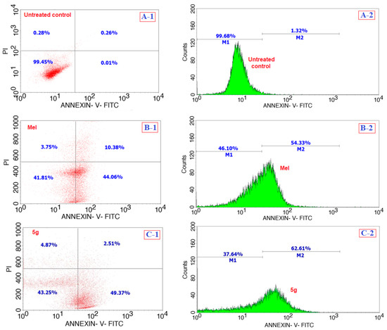 Comparison of the apoptosis assay results of the testing compound 5g (C) with those of the positive control Mel (B), and the negative control of cells without any treatment (A) over a period of 24 h.