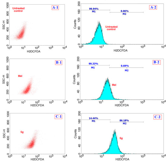 Comparison of flow cytometric analysis of the generation of reactive oxygen species (ROS) in HepG2 cells after treatment with the compound 5g (C) with that of the positive control Mel (B), and the negative control of cells without any treatment (A) over a period of 24 h.