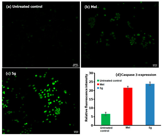 Caspase-3 activity of HepG2 cells when treated against the testing compound 5g (c) and the positive control of Mel (b). The cells without any treatment were taken as the negative control (a), and the relative fluorescence intensities are shown in (d).