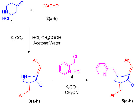 Synthesis model employed for the formation of N-pyridinylmethyl-bisarylmethylidenepyridinones 5(a–h).