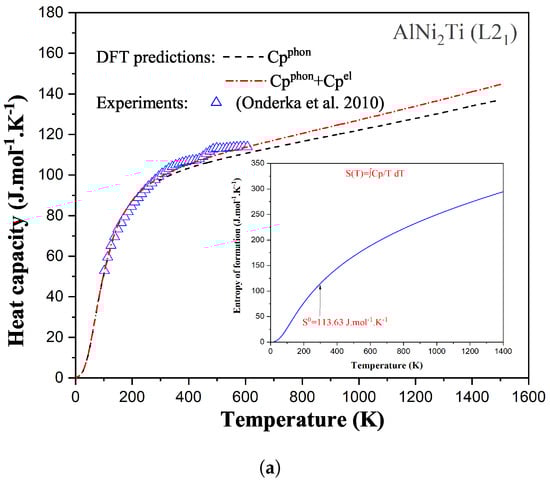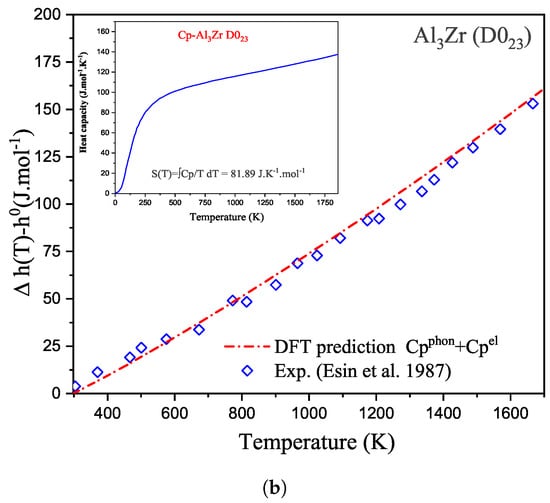Equation (2) requires the measurement of the low temperature behavior of the isobaric heat capacity. For many stable and most metastable compounds, experimental heat capacity data are not available, especially in the low temperature range. Traditionally, the CALPHAD community used to estimate unknown (and heat capacities) using the Neumann–Kopp rule [6]. This rule simply assumes a linear behavior of the estimated thermodynamic property versus composition. For disordered solid solutions and molten phases, the Kopp–Neumann rule has been proven to be a good approximation in many cases. However, for stoichiometric compounds, it has severe limitations, mainly related to the difference in the electronic structure between the compound and its constituent elements (in their stable solid structures). To overcome this lack of experimental data, it is nowadays possible to use atomistic simulations based on Density Functional Theory (DFT) using the Kohn–Sham approximation [7,8]. Ground-state DFT simulations of solid phases have shown a very good accuracy in predicting the enthalpy of formation, elastic properties, and phonon spectrum within reasonably low calculation times, especially for inorganic materials [9]. The quasi-harmonic approximation is typically coupled with DFT simulations to evaluate the evolution of a given solid phase as a function of temperature [10]. Examples of our DFT simulations based on a thermodynamically self-consistent method [11,12] used to determine the function of compounds are illustrated in Figure 2 for the AlNiTi phase (a Heusler compound with an structure—Fmm) and for the AlZr intermetallic (D0 structure—I4/mmm), respectively. In this figure, the heat capacities of these two compounds have been predicted from DFT simulations and compared with available experimental data. The introduction of both phonon (vibrational) and electronic contributions into the description of the isobaric heat capacity leads to an accurate prediction of each (and therefore of the entropy as well when integrated from 0 K) as shown in this figure.