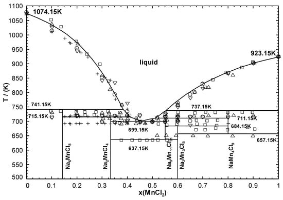 Calculated NaCl-MnCl phase diagram along with experimental data: , Sandonnini and Scarpa [22]; , Safonov et al. [23]; , Yakovleva et al. [24]; , Seifert and Koknat [25]; , Seifert and Flohr [26]—reprinted from [19] with permission from Elsevier.
