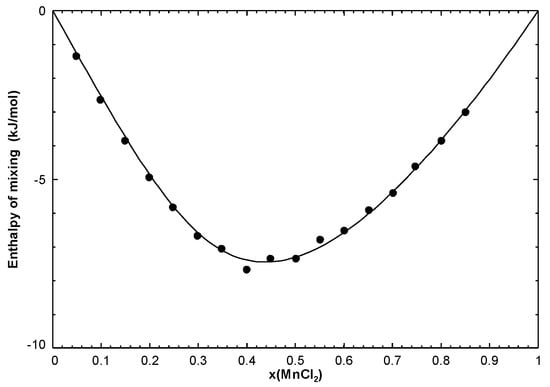 For instance, let us consider the NaCl-MnCl binary system, which was modelled previously [19]. The liquid phase was modelled using the Modified Quasichemical Model for short-range ordering [16], and an expression of its Gibbs free energy as a function of temperature and composition was obtained. The calculated phase diagram, enthalpy of mixing of the liquid at 1083.15 K, and activity of NaCl (relative to liquid standard state) in the liquid at 885.15 K and 1085.15 K are shown along with the available measurements in Figure 3, Figure 4, and Figure 5, respectively. As can be seen in Figure 3, there are five stoichiometric compounds (NaMnCl, NaMnCl, NaMnCl, NaMnCl, and NaMnCl). The enthalpies of formation from solid NaCl and MnCl of NaMnCl, NaMnCl, NaMnCl, and metastable NaMnCl (ilmenite structure) at 298.15 K have been measured by solution calorimetry. In addition, the Gibbs free energy changes for various reactions of formation of the five intermediate compounds have been measured over specific temperature ranges using an emf technique. All these data are reproduced by the model within the experimental error limits [19]. A similar approach needs to be used for all remaining subsystems of the multicomponent system of interest (i.e., NaCl-MgCl, NaCl-CaCl, MgCl-CaCl, MgCl-MnCl and CaCl-MnCl for NaCl-MgCl-CaCl-MnCl). If only phase diagram data are available for a given binary subsystem, some assumptions may have to be made. For instance, for MgCl-MnCl, a solid solution was reported over the entire composition range [20]. Thus, in principle, there is an infinite number of sets of excess Gibbs free energy expressions for the solid solution and the liquid phase permitting one to reproduce the experimental phase diagram. However, owing to the very similar cationic radii of Mg and Mn [21], the MgCl-MnCl liquid can be assumed to be close to ideality, thus permitting one to model the solid solution unambiguously. Calorimetric measurements at 1083.15 K exhibiting a maximum enthalpy of mixing of about 350 J/mol confirm the validity of this assumption [20]. For a given binary subsystem, if there are only liquidus data and if negligible solid solubility is observed, then only the chemical potentials of the two components in the liquid phase along the liquidus are defined. In that case, in the absence of enthalpy of mixing data, only enthalpic parameters without any excess non-ideal entropic parameters ought to be introduced in the optimized excess Gibbs free energy of the liquid phase. Finally, if phase diagram data are lacking, estimations might be made from a chemically similar binary system for which such data are available. Although the corresponding results might not be quantitatively accurate, a reasonable trend should be observed.